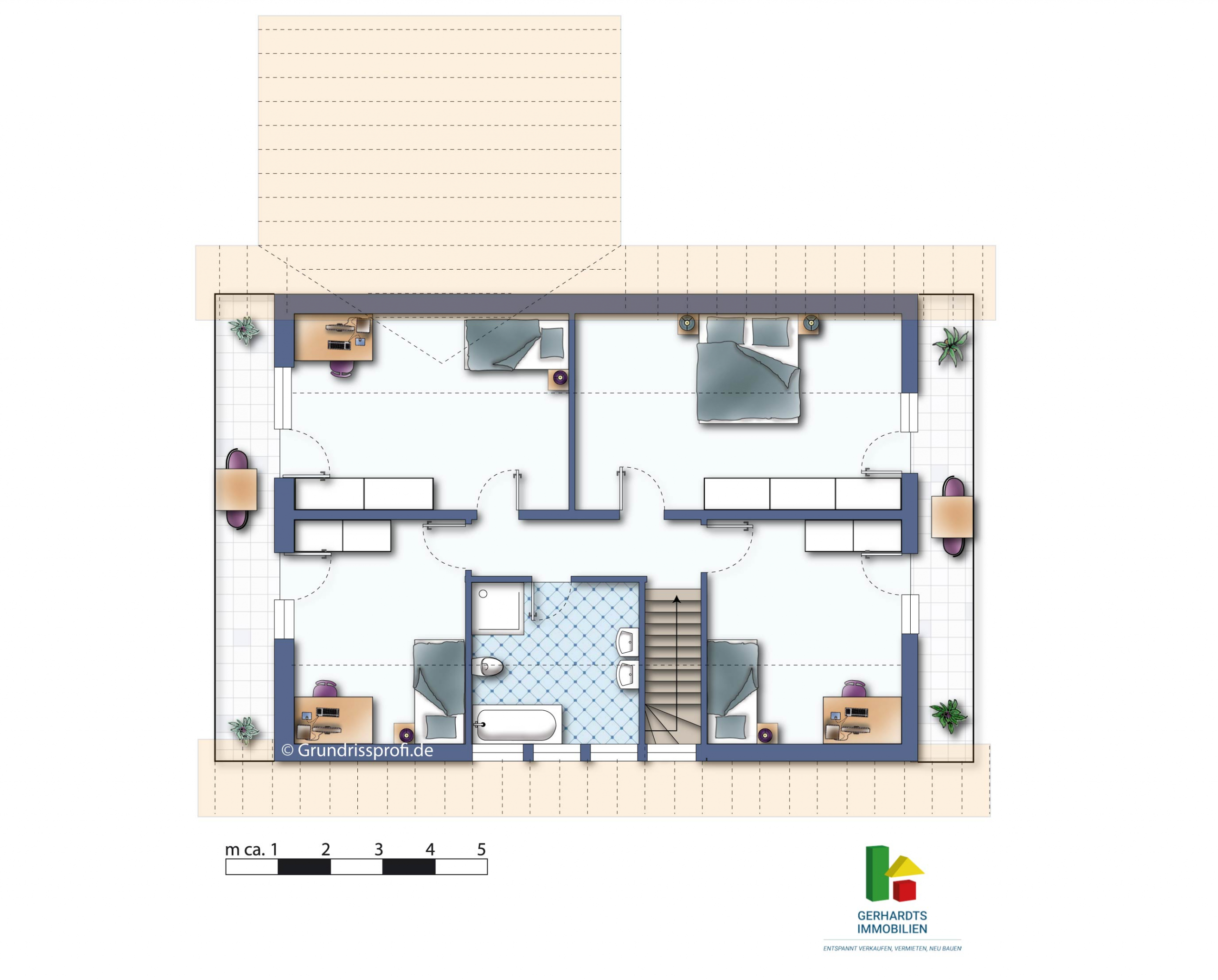 Im Dachgeschoss erwarten Sie vier Schlafzimmer – jedes davon mit Zugang zu einem der beiden giebelseitigen, überdachten Balkone. Hier atmet man morgens frische Luft und abends Ruhe.