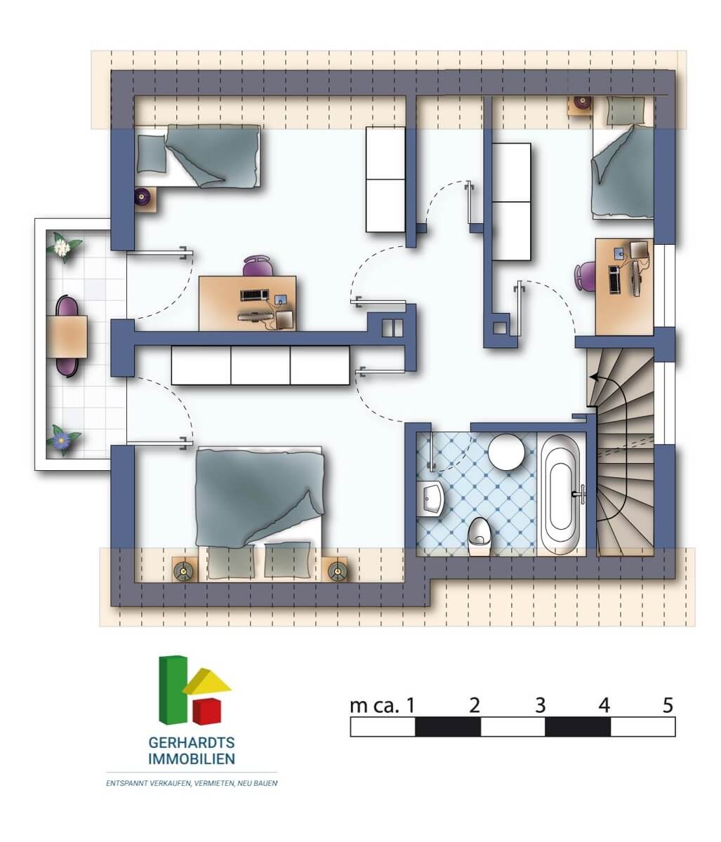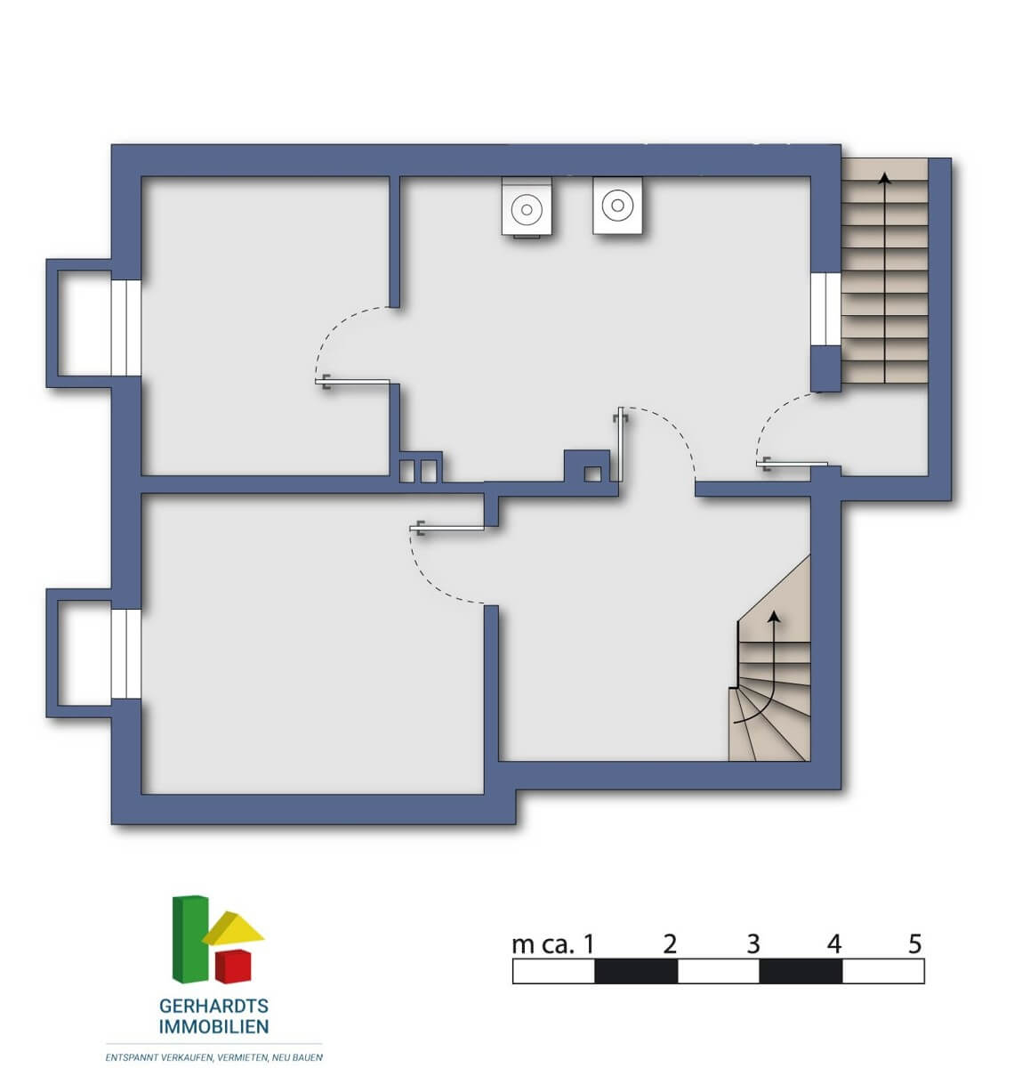 Im Obergeschoss befinden sich drei vielseitig nutzbare Schlafzimmer, von denen sich eines hervorragend als Kinderzimmer, Home-Office oder Gästezimmer eignet. Ein heller, modernisierter Abstellraum sowie ein Tageslichtbad mit Wanne und Duschvorrichtung vervollständigen diese Etage. Das Haus ist vollständig unterkellert. Hier finden Sie zusätzlichen Stauraum sowie einen Wasch- und Trockenraum mit direktem Zugang zum Garten – eine äußerst praktische Lösung.