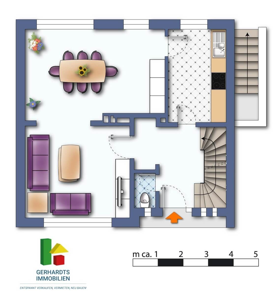 Betreten Sie Ihr neues Zuhause durch eine einladende Diele im Erdgeschoss. Hier finden Sie eine praktische Garderobennische und ein Gäste-WC. Das Herzstück bildet der offene, L-förmige Wohn- und Essbereich, der dank seiner großzügigen Aufteilung viel Raum für Ihre individuellen Einrichtungsideen bietet. Die angrenzende Küche ermöglicht einen direkten Zugang zur großen, überdachten Terrasse mit idealer Westausrichtung, perfekt für sonnige Nachmittage und entspannte Abende im Freien.