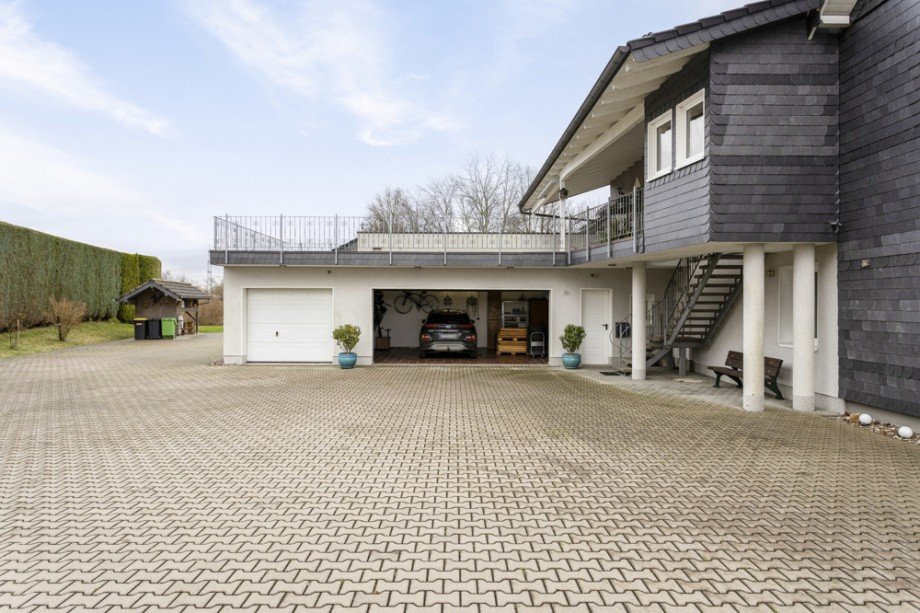 Über eine außenliegende Treppe gelangst du in die geräumige Diele der Betriebsleiterwohnung, die einen offenen Wohn- und Essbereich mit einer modernen Einbauküche umfasst – bereits im Kaufpreis enthalten. Ein weiterer Flur führt zu einem großen Tageslichtbad, einem Ankleidezimmer sowie einem Schlafzimmer. Über den Garagen erstreckt sich eine beeindruckende Terrasse, die zum Verweilen einlädt.